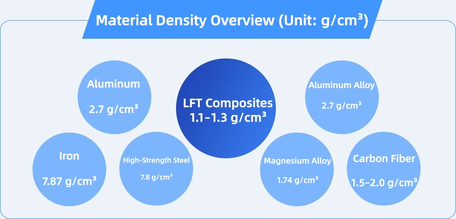 Density: 1.2–1.4 g/cm³ (50%–65% lighter than steel)